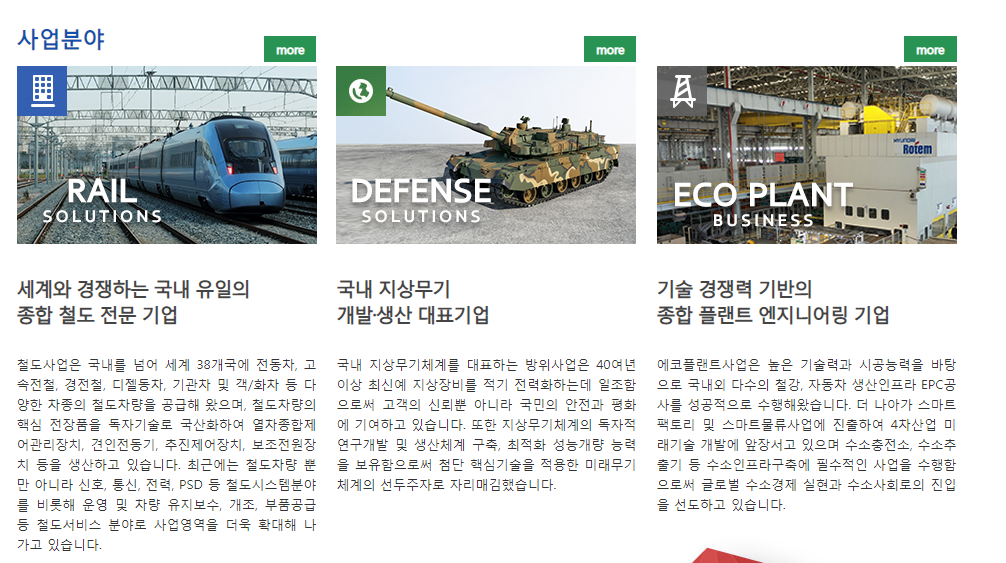 현대로템은 1999년 설립되어 국가 기간산업인 철도차량 제작, E&M (Electrical & Mechanical) 및 O&M (Operation & Maintenance) 등을 영위하고 있는 레일 설루션 사업과, K계열 전차와 차륜형장갑차 양산사업, 창정비 사업 등을 수행하는 디펜스솔루션 사업, 그리고 제철설비와 완성차 생산설비, 스마트팩토리 설비 및 수소인프라 설비 등을 납품하는 에코플랜트 사업을 영위하고 있습니다.