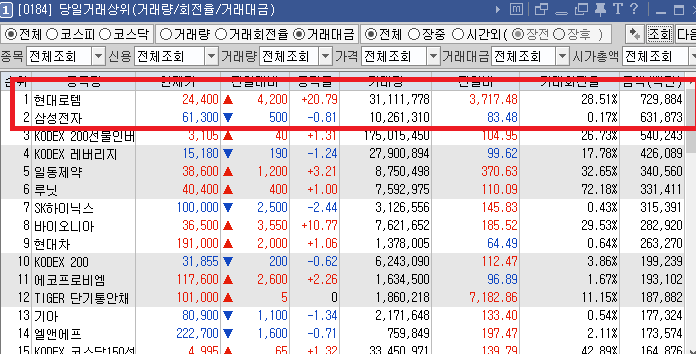 안녕하세요 벨카입니다. 오늘 주식시장에서 가장 거래대금이 많이 일어난 종목인 현대로템을 분석하려고 합니다. 국내 주식시장 거래대금 1위는 항상 삼성전자가 차지하였는데 오늘 삼성전자 거래대금을 제치고 현대로템이 당일거래대금 상위 1위를 차지하였습니다.