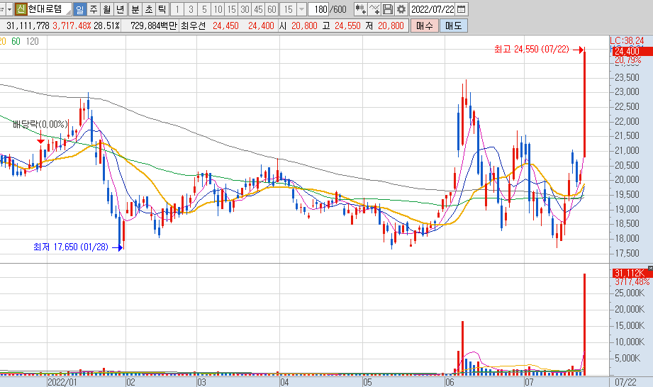 현대로템은 거래대금 7,200억 원에 달하며, 장대양봉의 차트를 보여주었습니다. 수급 또한 외국인과 기관에서 쌍글이 매수를 하면서 상승추세를 보여주고 있으며, 조정구간인 1차 매수가 23,000원 부근에서 분할로 접근해보겠습니다.