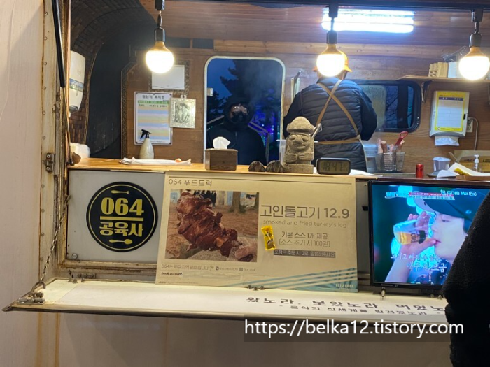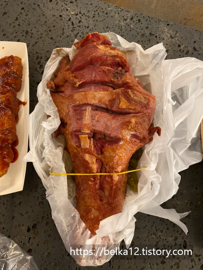제주도 수목원길 야시장의 대표 음식으로 고인돌고기를 찾아서 저희도 고인돌고기를 줄 서서 맛을 봤습니다. 만화에서 보던 칠면조 다리를 예전에도 한번 먹어 본 적이 있었는데 이곳은 살이 정말 야들야들하고 맛있었습니다!! 하지만 한번 정도 먹을만 한거 같고 즐겨찾지는 않을거 같습니다.