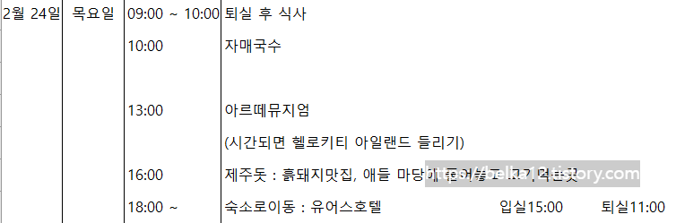 자매국수집 → 아드떼뮤지엄 → 헬로키티 아일랜드→제주돗 → 유어스호텔