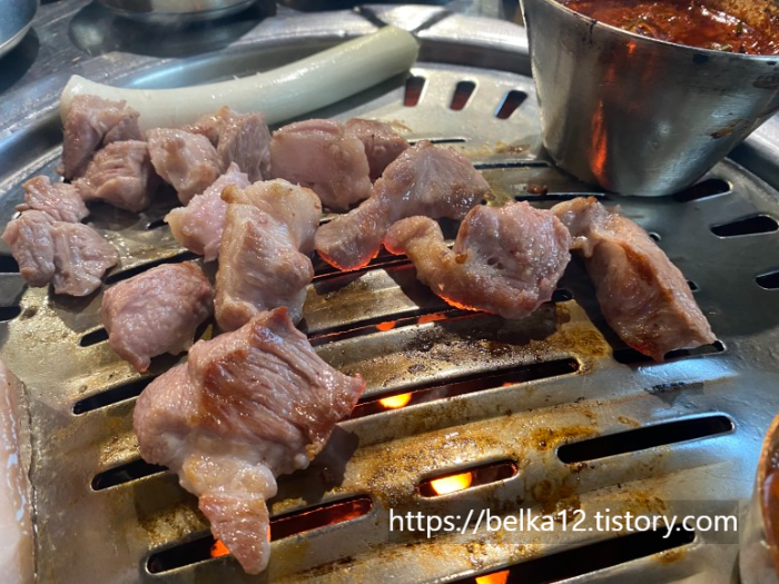 먼저 고기의 상태를 보여주고 구워줍니다! 특히 큰돈가의 특제소스와 함께 곁들여서 먹으면 정말 맛있었습니다.