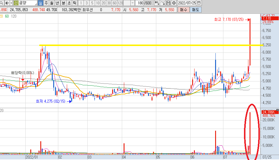 금양 일봉 차트를 보면 전고점을 거래대금과 함께 뚫어주면서 장대양봉을 만들면서 마감을 하였습니다. 하지만 금양의 주봉을 보시면 7,800원 부근에 매물대를 어떻게 뚫어주는지도 지켜봐야 할거 같습니다.