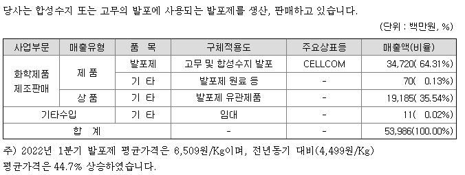 매출의 64% 대부분인 발포제를 생산하여 판매를 하고 있으며, 발포제 유관 제품이 약 35% 정도 차지하고 있습니다.