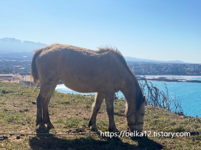 특히 말도 있어서 더욱 제주도에 온 느낌을 받을 수 있었습니다. 바닷가와 도시를 산에서 보는 진귀한 경치를 볼 수 있는 곳이기에 서우봉을 추천드립니다.