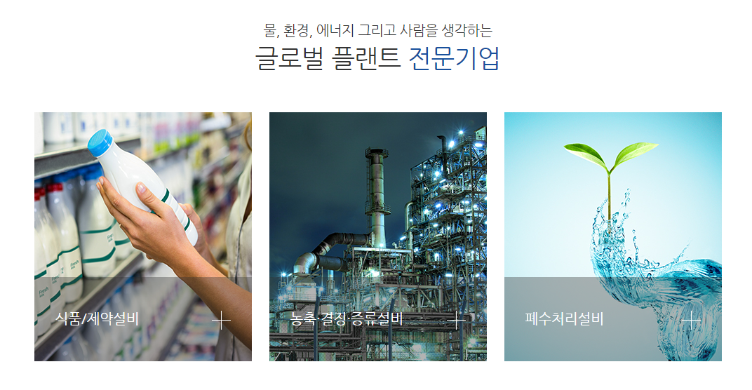 플랜트 부문은 식품제약, 설비, 농축 및 중류, 건조 설비, 환경설비(폐수처리 설비, 음식물 / 축사폐수 자원화 설비, 정수 및 폐수 재이용 설비, 해수담수화 설비, 슬러지 건조설비) 에너지 발전 설비(폐기물 에너지화, 바오이매스 연료화, 태양광 발전 등)를 서비스를 하고 있습니다.