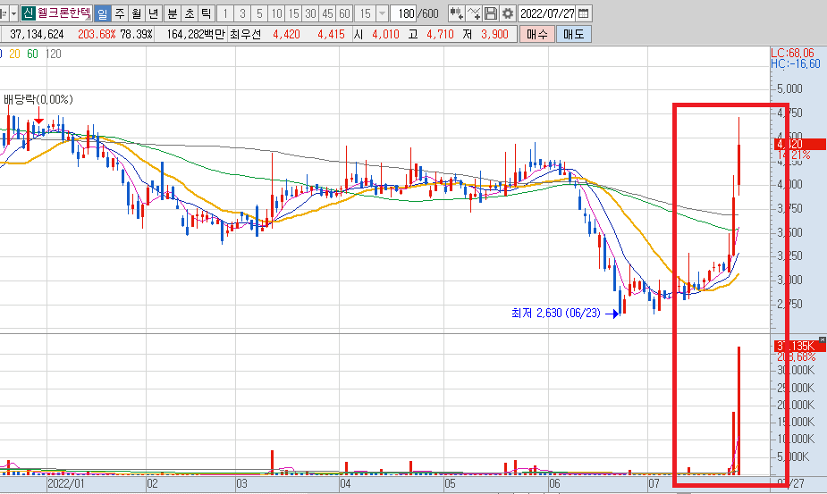 안녕하세요 벨카입니다. 7월 27일 다양한 종목들이 상승을 했지만 그중 관심이 가는 종목인 웰크론한텍에 대해서 포스팅을 하려고 합니다. 거래대금도 약 1,600억 원 정도 일어났으면 차트도 상승추세 전환의 모습을 보이고 있어서 관심이 가고 있습니다.