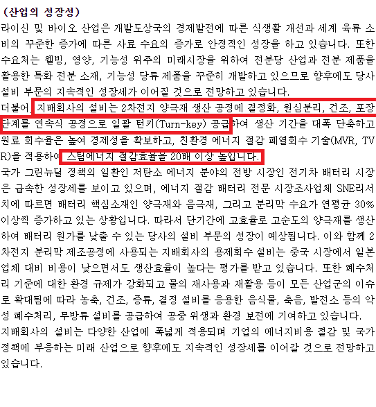 사업보고서 발췌한 내용을 보면 웰크론한텍의 설비는 2차 전지 양극재 생산 공정에 결정화, 원심분리, 건조, 포장단계를 연속식 공정으로 일괄 턴키 공급을 하고 있으며, 친환경 에너지 절감 폐열회수 기술을 적용하여 스팀에너지 절감 효율을 20배 이상 높인다고 나와있습니다.