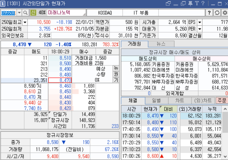 미래나노텍 시간외단일가 및 수급