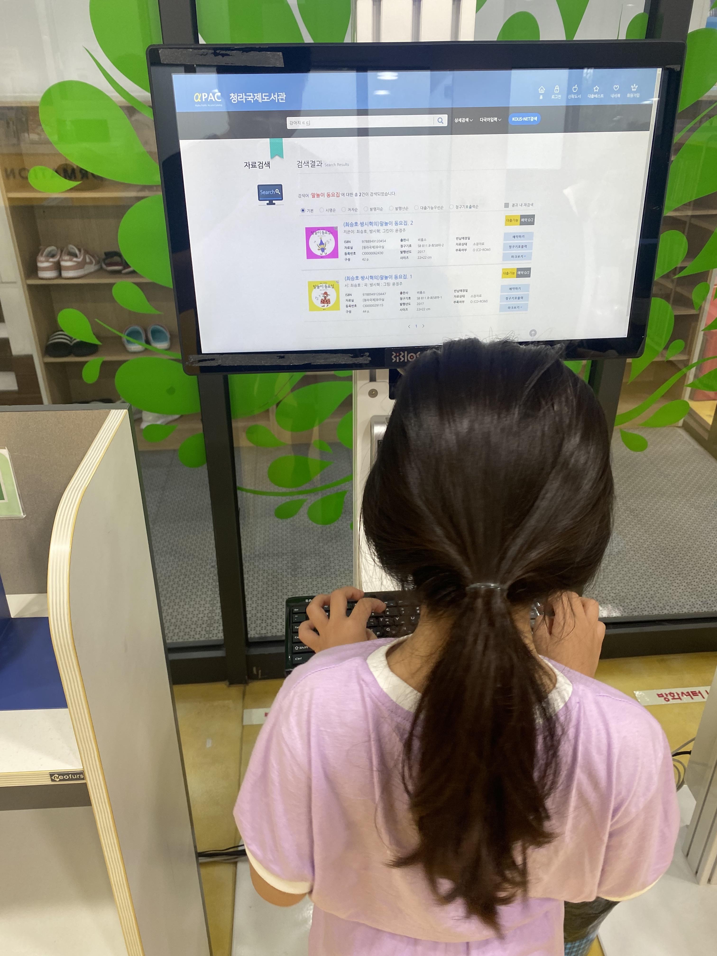 딸이 학교에서 읽어야 할 책을 검색대를 통하여 찾고 있습니다.