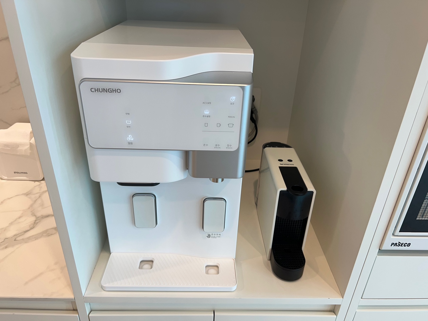 또한 식사는 배달을 시켜먹거나 챙겨 와서 먹을 수 있어서 식기류와 정수기가 마련되어 있습니다.