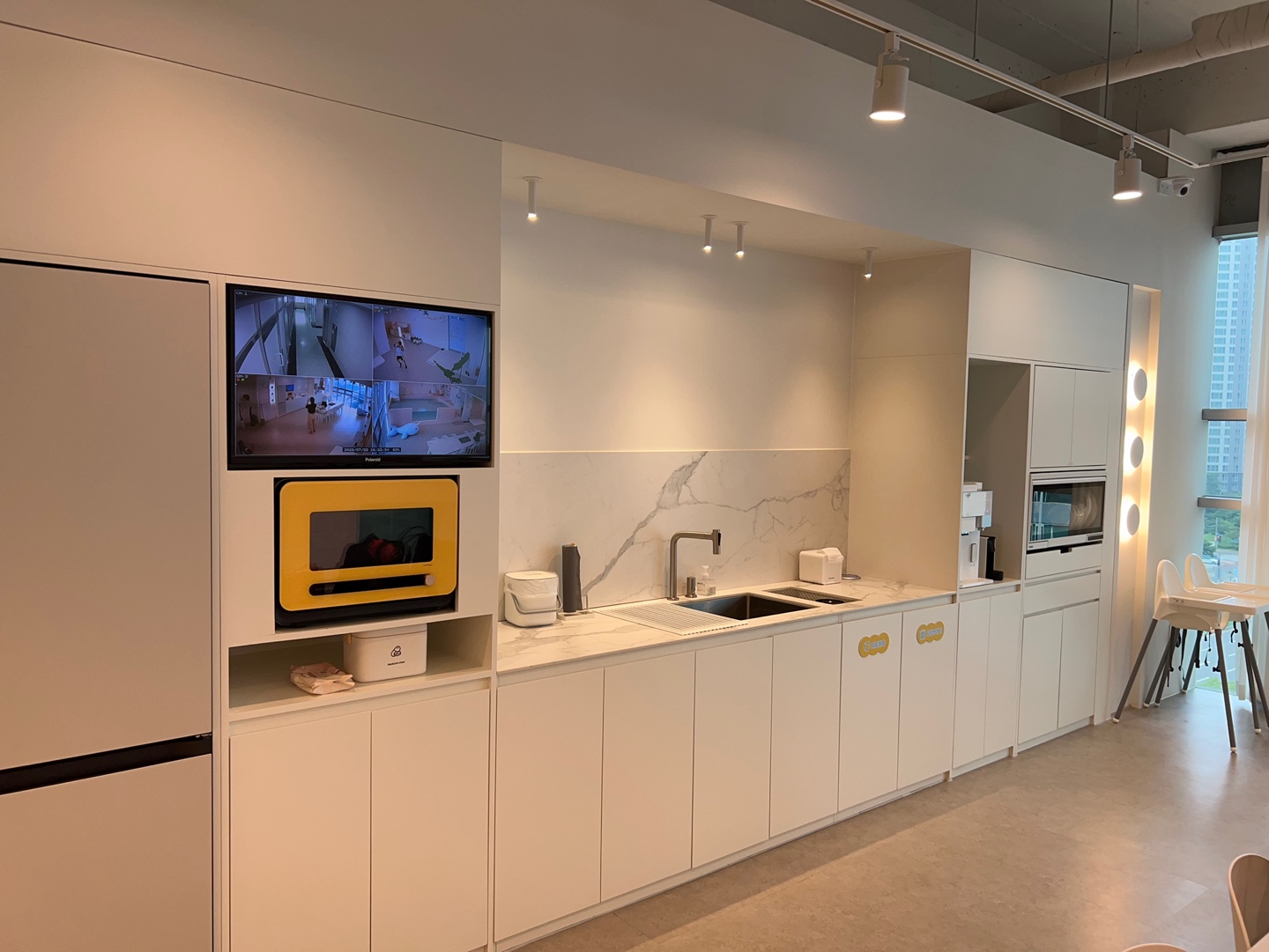전체적인 주방구조는 이렇게 되어 있습니다. 설거지도 할 수 있는 공간도 마련되어 있습니다. 전체적인 인테리어가 화이트톤 계열이어서 사진이 정말 잘 나오는 공간이기도 합니다.