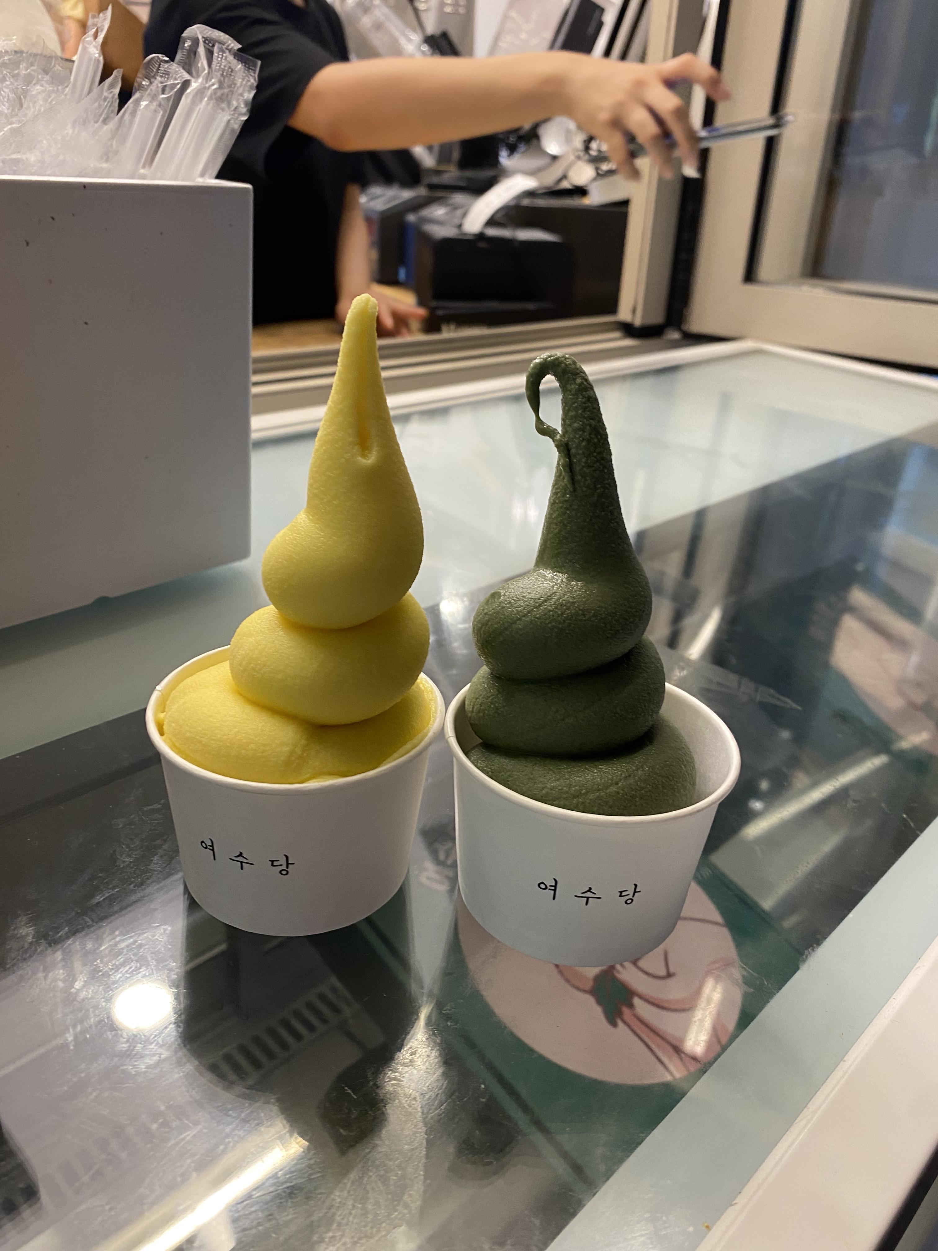 저희는 웨이팅이 너무 길어서 간단하게 먹을 수 있는 여수당의 대표 아이스크림인 쑥아이스크림과 옥수수아이스크림을 주문해서 먹었습니다. 아이스크림의 맛은 입에서 살살 녹으면서 쑥의 맛보다는 건강한 아이스크림의 맛을 느꼈습니다.