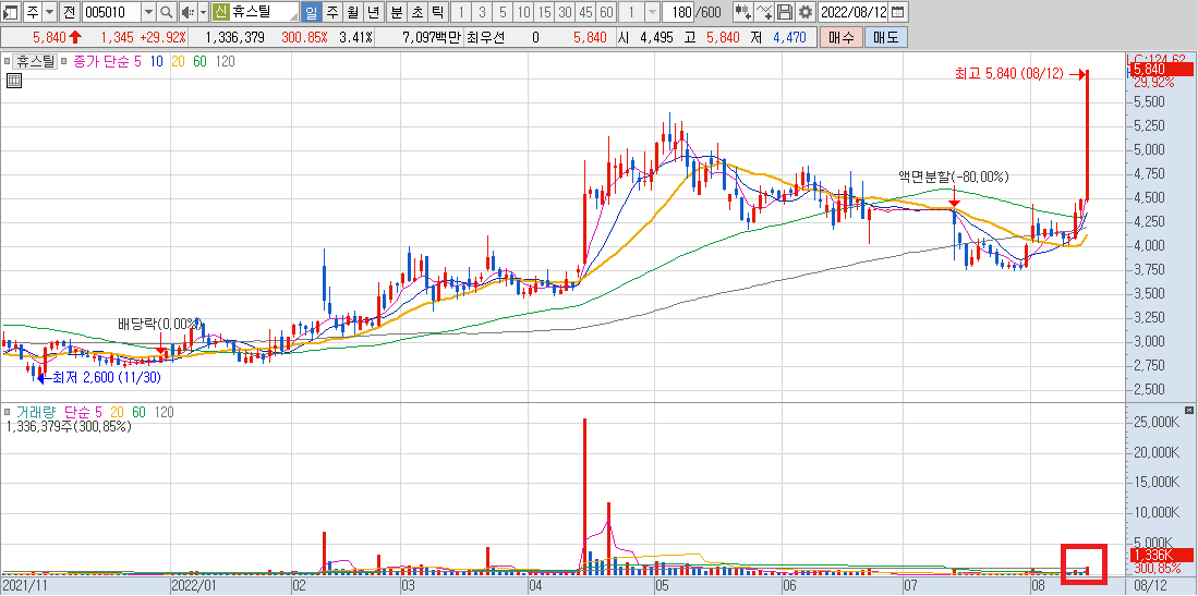 휴스틸 일봉 차트를 보시면 10분 동시호가로 상한가에 갔기 때문에 많은 거래대금이 일어나지는 않았습니다.