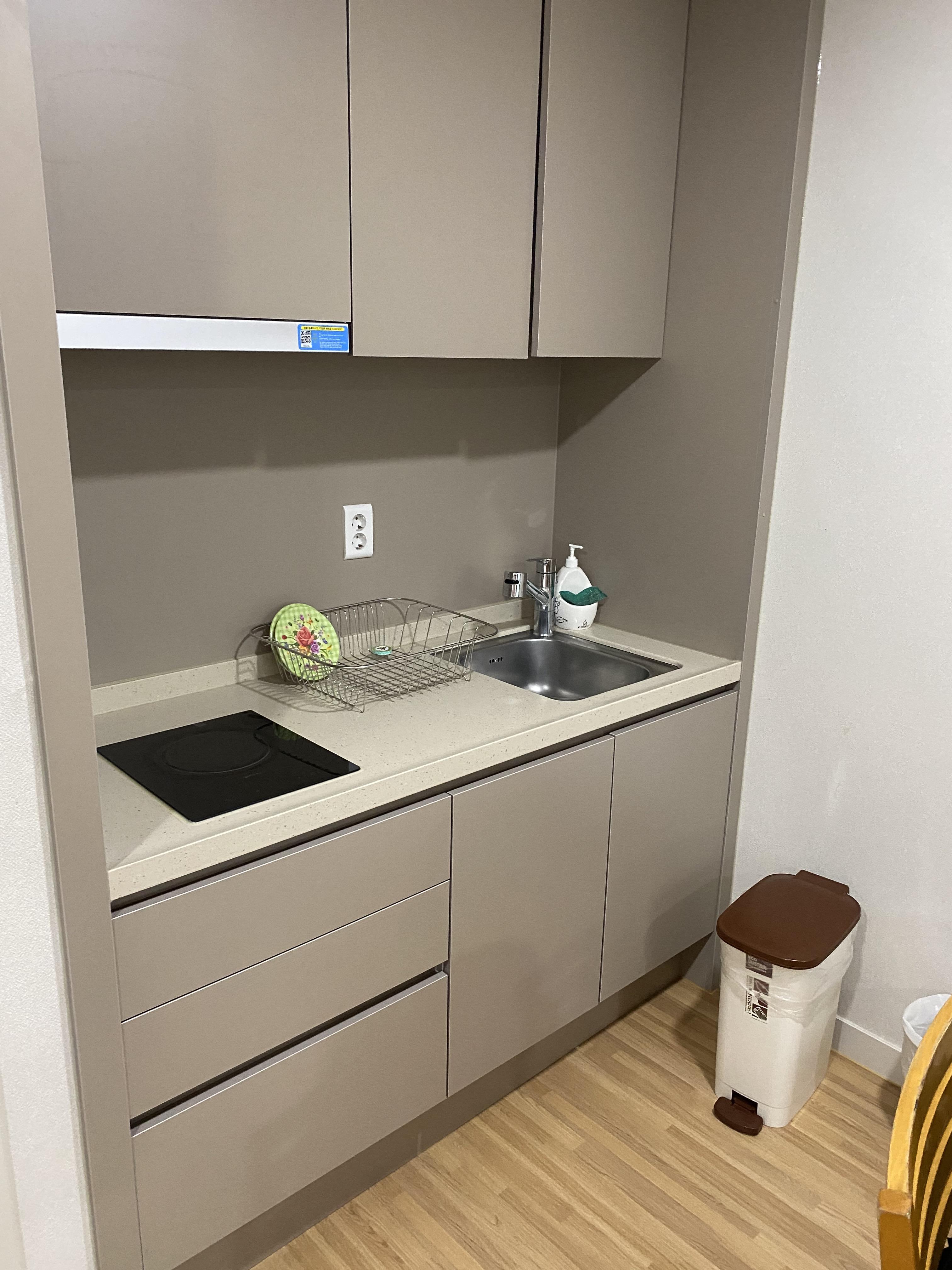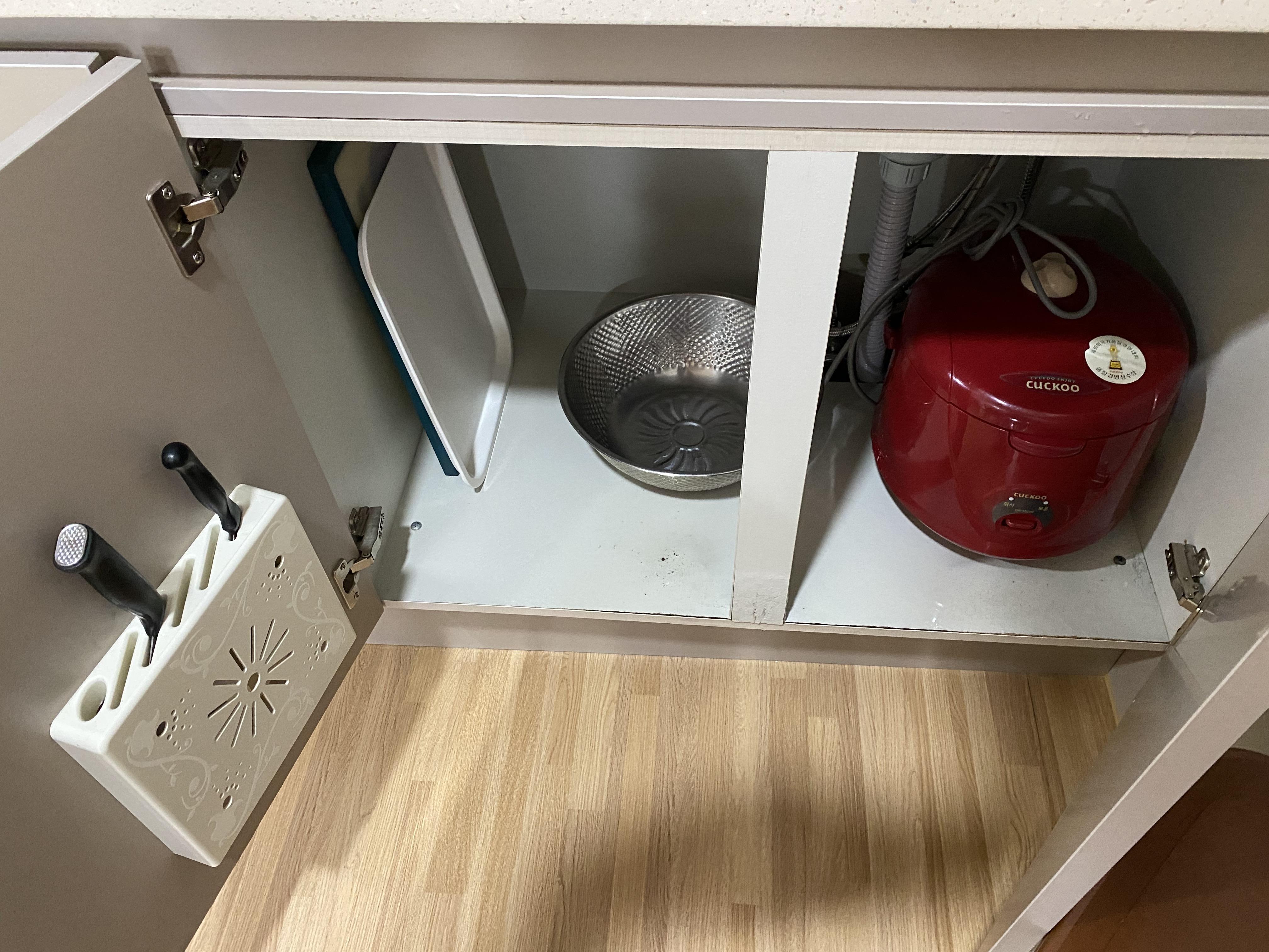 주방에는 식기, 집기, 수저, 칼, 밥솥, 냄비, 프라이팬 등 웬만한 주방기구들이 비치되어 있습니다. 그래서 숙박 안에서 조리를 해 먹을 수 있지만 저희는 배달음식으로 다 시켜먹었네요.