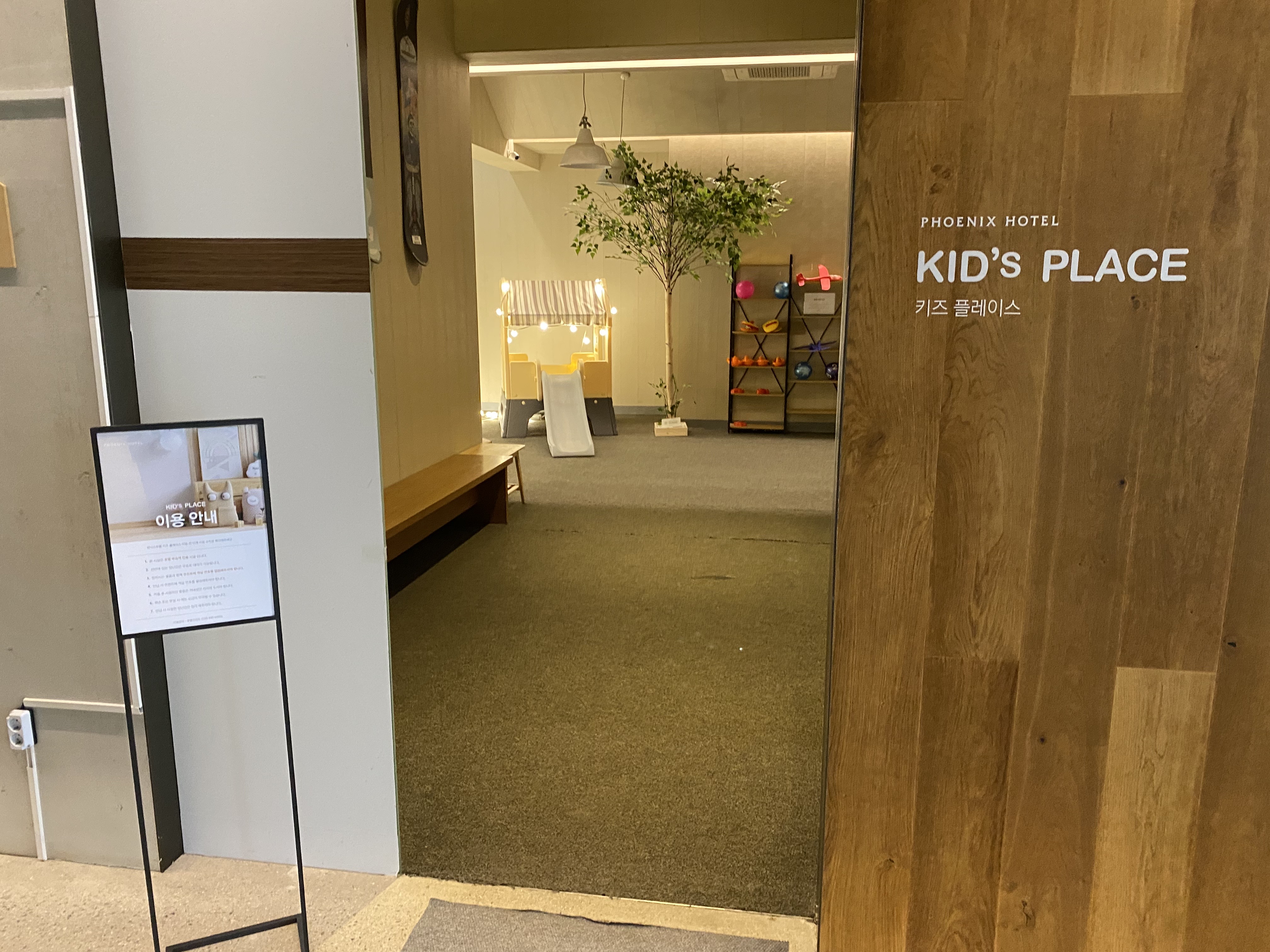 휘닉스파크 호텔동 로비에는 앉아서 쉴 수 있는 공간과 아이들이 놀 수 있는 키즈플레이스가 마련되어 있습니다.