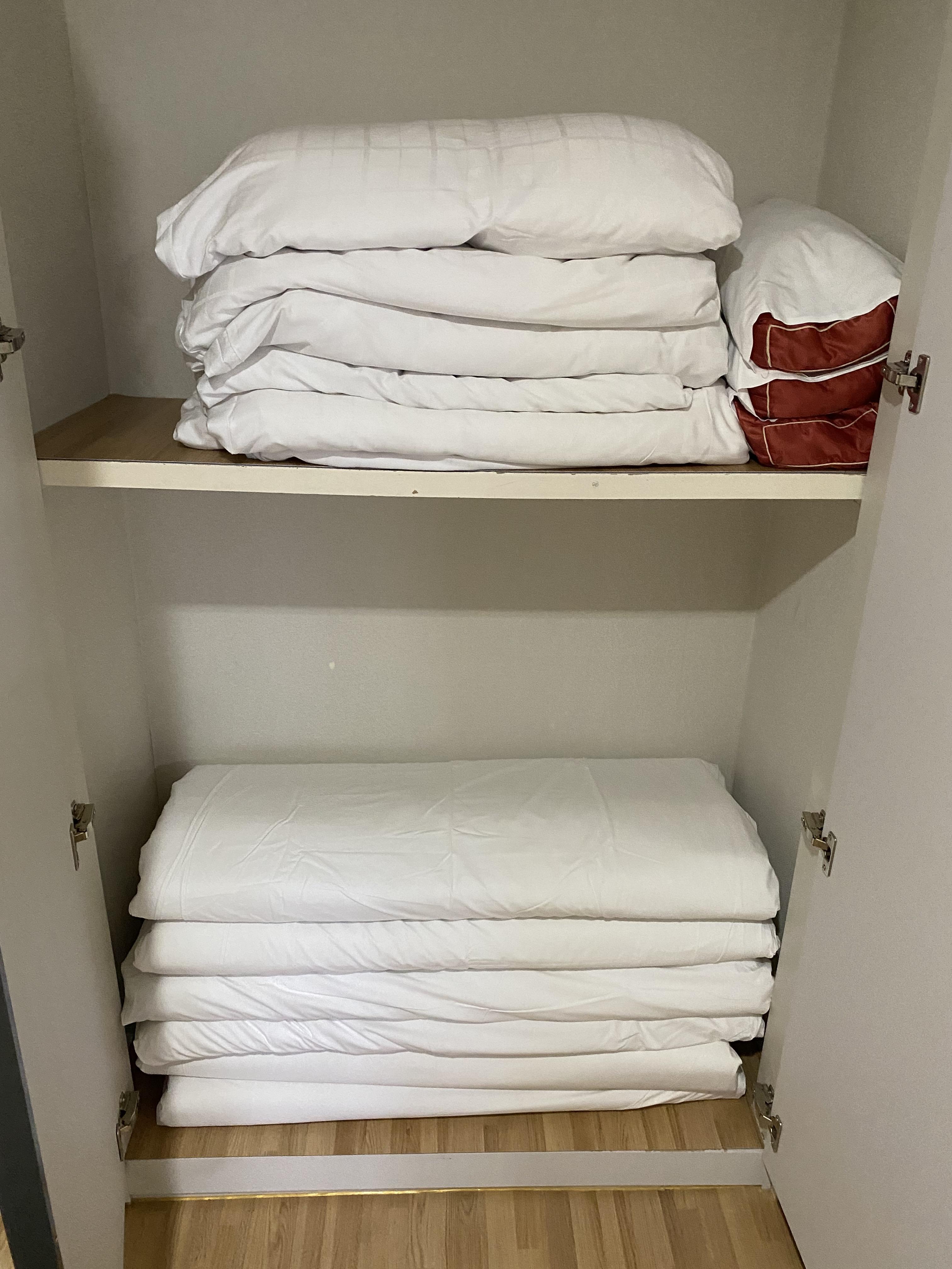 참고로 입구 쪽에 위치한 선반에 빨래 건조대와 헤어 드라이기, 휴지 여분이 비치되어 있습니다.