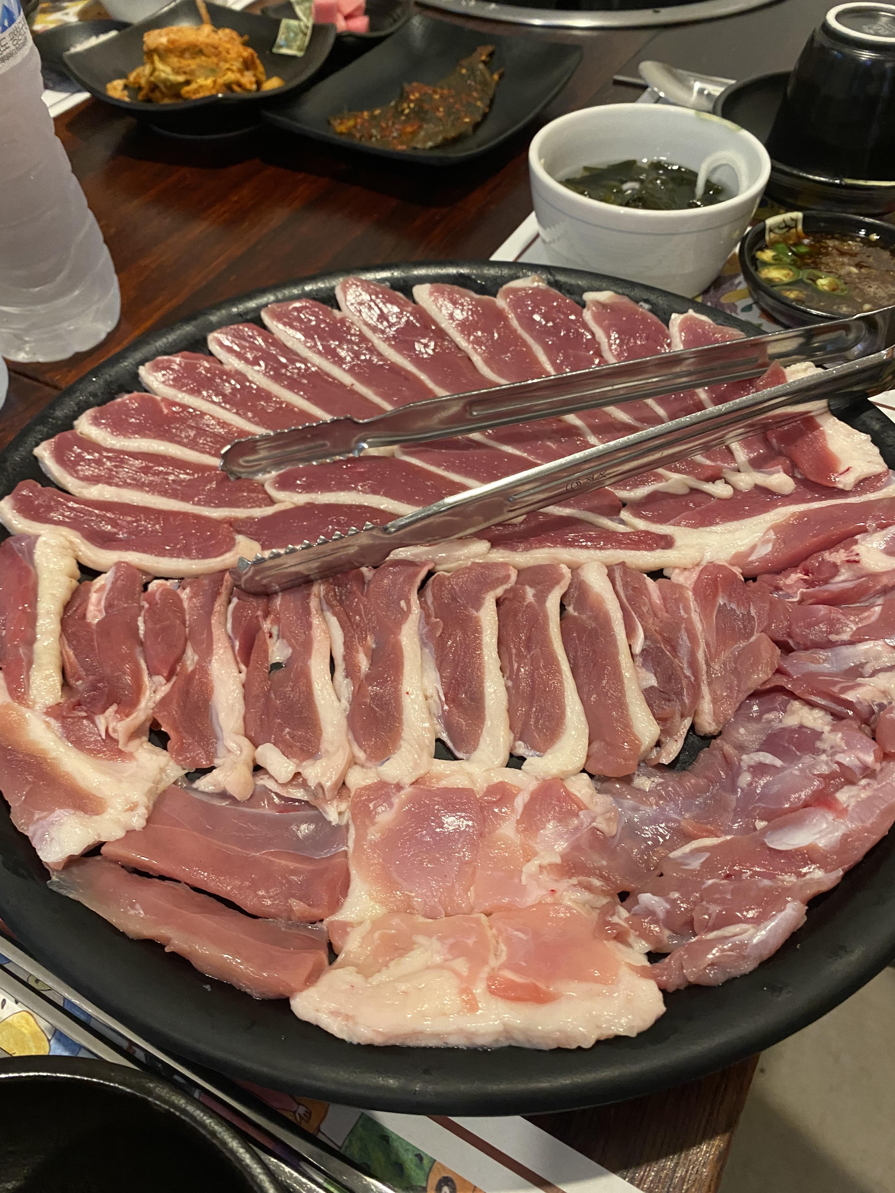 오리고기가 이렇게 나오는데 빛깔이 정말 예술이었습니다. 저는 오리고기를 이렇게 구워서 먹었던 적이 없어서 그런지 신기하더라고요. 오리고기의 부위별로 굽는 방법과 먹는 방법이 있어서 처음 오신 분은 서빙하시는 분에게 꼭 물어봐야 합니다.