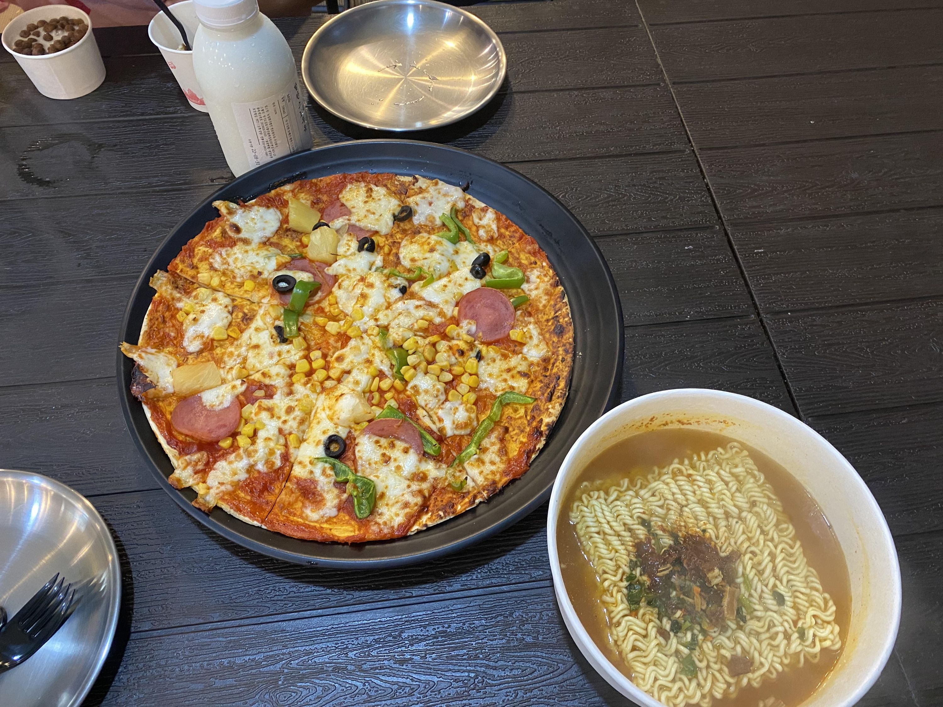 피자와 함께 우유, 치즈가 제공이 됩니다. 저는 배고파서 라면도 함께 먹었네요.