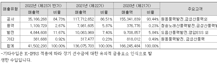 대명에너지 매출 비율을 보면 대부분이 공사에서 나타나고 있습니다. 주요 고객은 원동풍력발전, 금성산풍력외로 나와있는 것으로 보아서 풍력에너지 쪽에서 매출이 발생하고 있습니다.