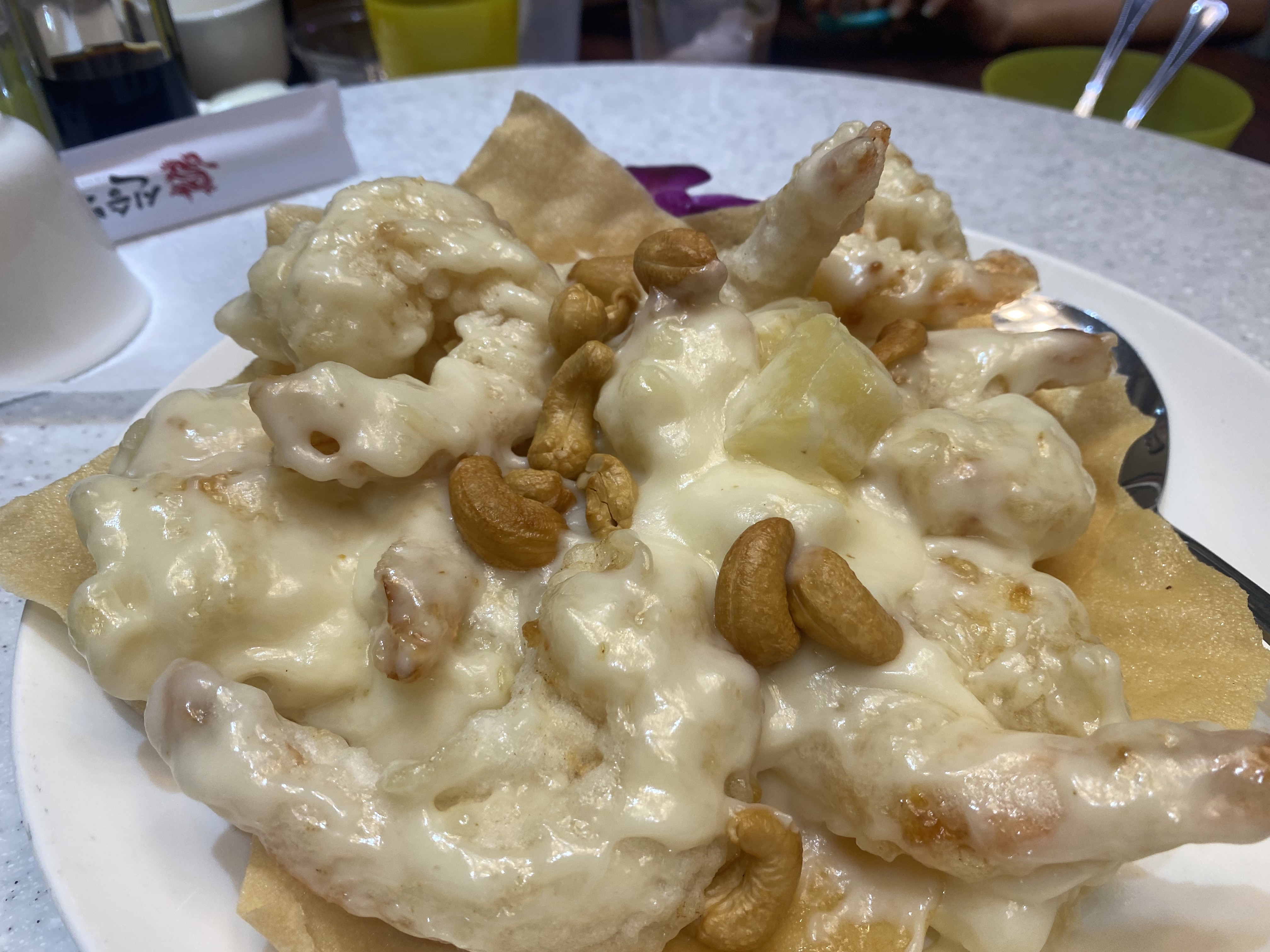 그릇 위에 과자로 만든 받침대 위해 새우와 크림으로 어우러져서 비주얼이 정말 맛있게 나옵니다. 크림 위에 땅콩과 파인애플도 곁들여져서 고소함과 달콤함을 더해져 크림중새우를 한입 베어 먹으면 정말 맛있었습니다.