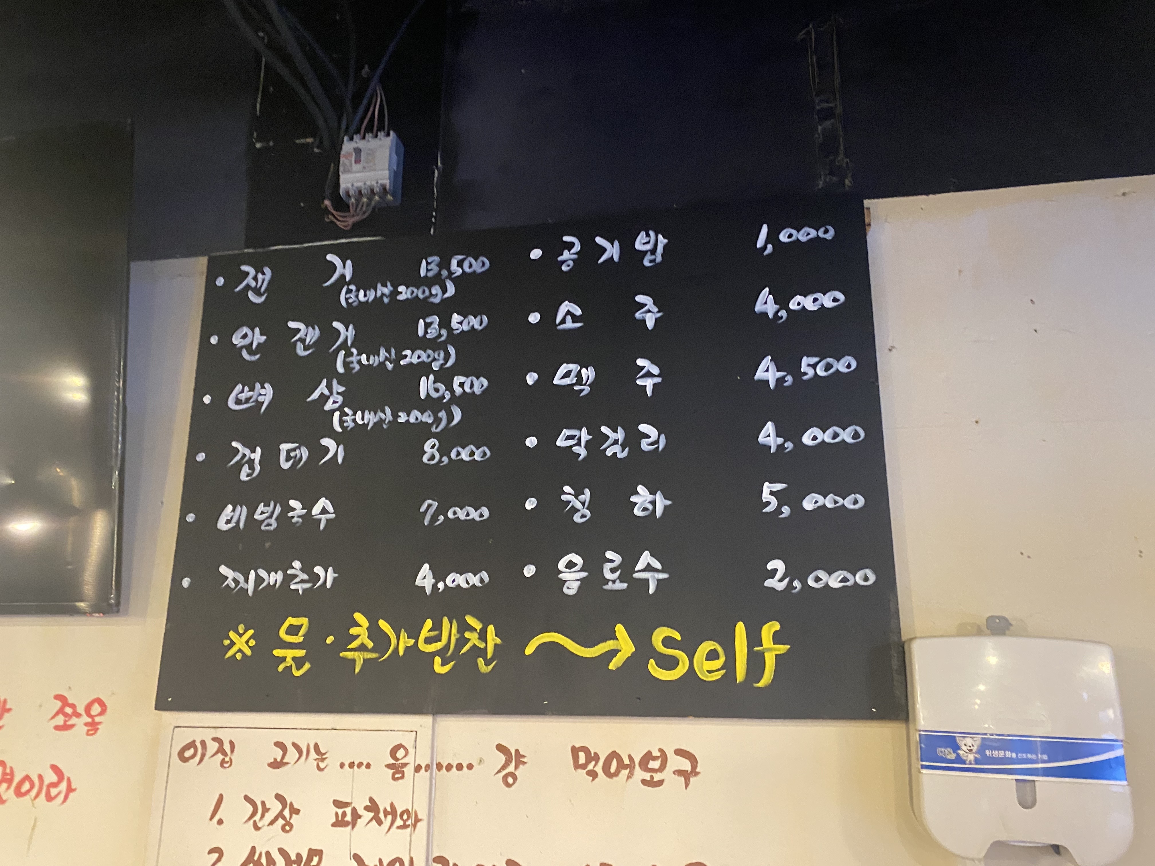 동암잰고기 메뉴는 맛집답게 단순하게 되어 있습니다. 잰거, 안잰거, 뼈삼, 껍데기, 비빔국수만 판매를 하고 있습니다.