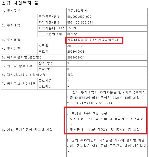 2022년 8월에 동국산업을 사업다각화를 위한 신규시설 투자를 위해서 투자금액 880억원을 사용하여 Ni도금 설비 외에 투자한다고 공시를 발표한 적이 있습니다.