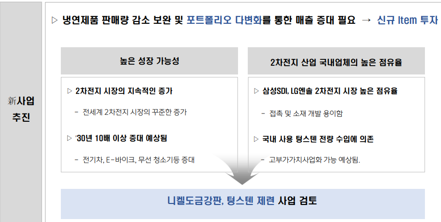 동국산업은 냉연제품 판매량 감소 보완 및 포트폴리오 다변화를 통한 매출 증대가 필요하여 신규 아이템에 투자를 진행했습니다. 높은 성장 가능성과 2차 전지 산업 국내업체의 높은 점유율을 발판 삼아 니켈도금강판, 텅스텐 제련 사업을 검토하였습니다.