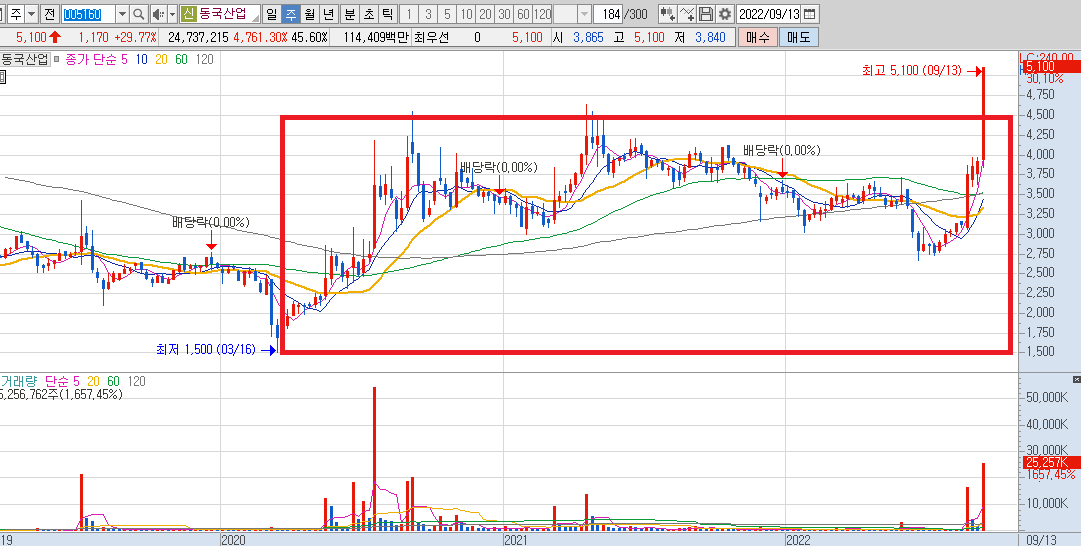 동국산업의 주봉 차트를 보시면 박스권을 돌파하였지만 거래대금이 아쉬운 모습입니다. 하지만 아직 1주가 마감이 안되었기 때문에 내일도 기대해볼 수 있는 상황이어서 좋은 자리가 나오면 대응해볼 생각입니다.