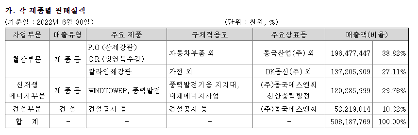 동국산업의 각 제품별 판매실적을 보시면 확인할 수 있습니다.