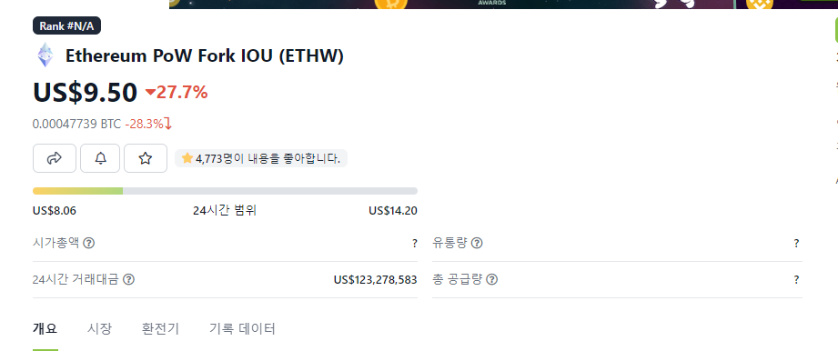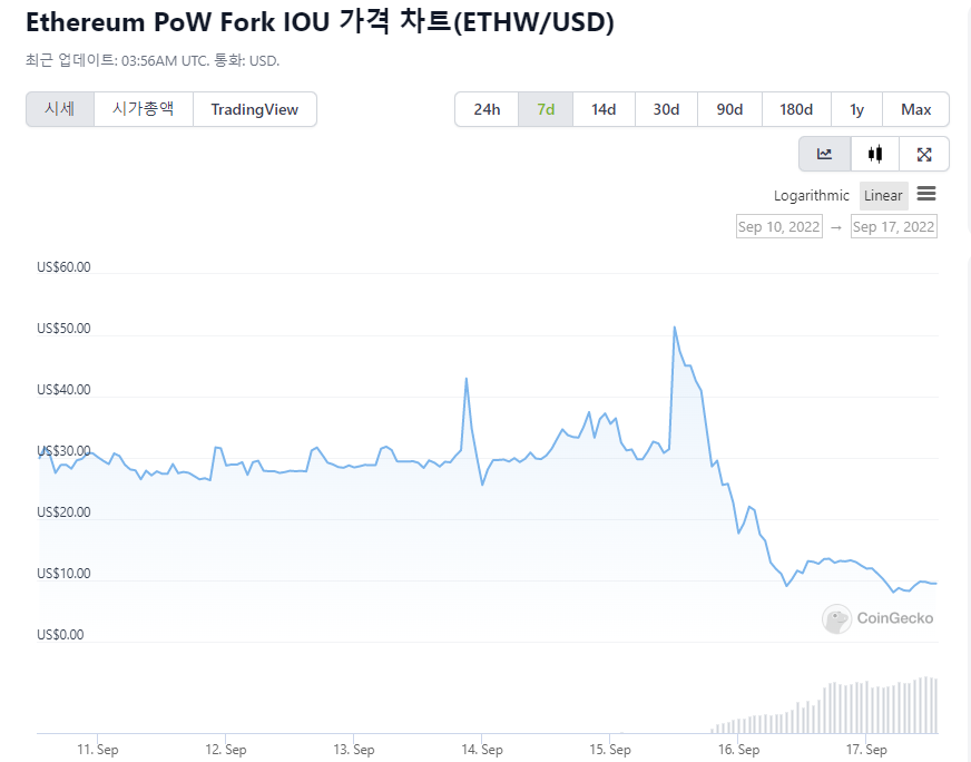 9/17 오후 1시 기준 이더리움W의 가격은 9.5달러에 형성되어 있습니다. 약 원화로 13,000원 정도에서 거래가 되고 있습니다.