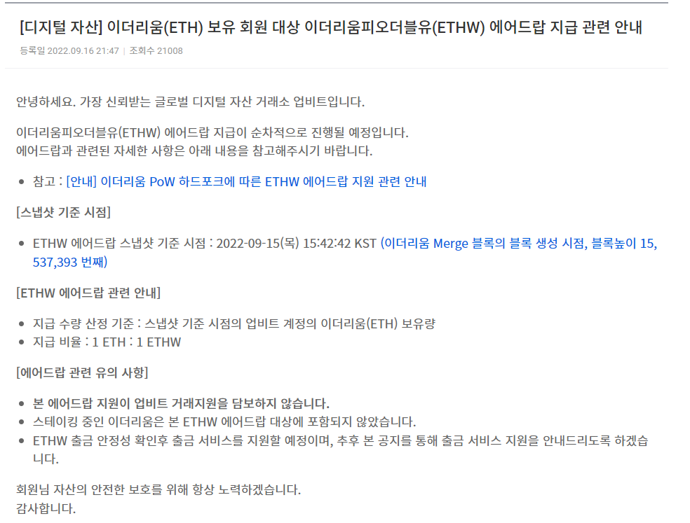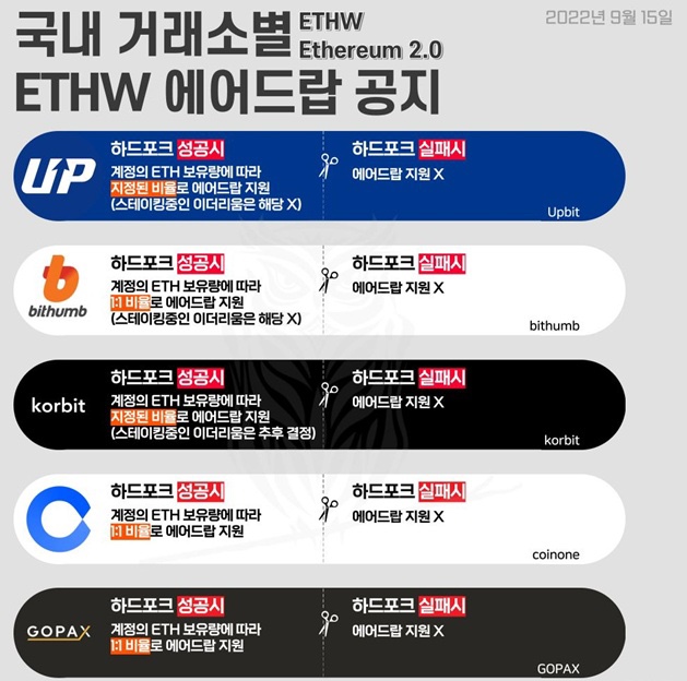 국내 5대 거래소는 이더리움 하드포크가 성공 시에 에어드랍을 지원할 것이라고 밝혔습니다.