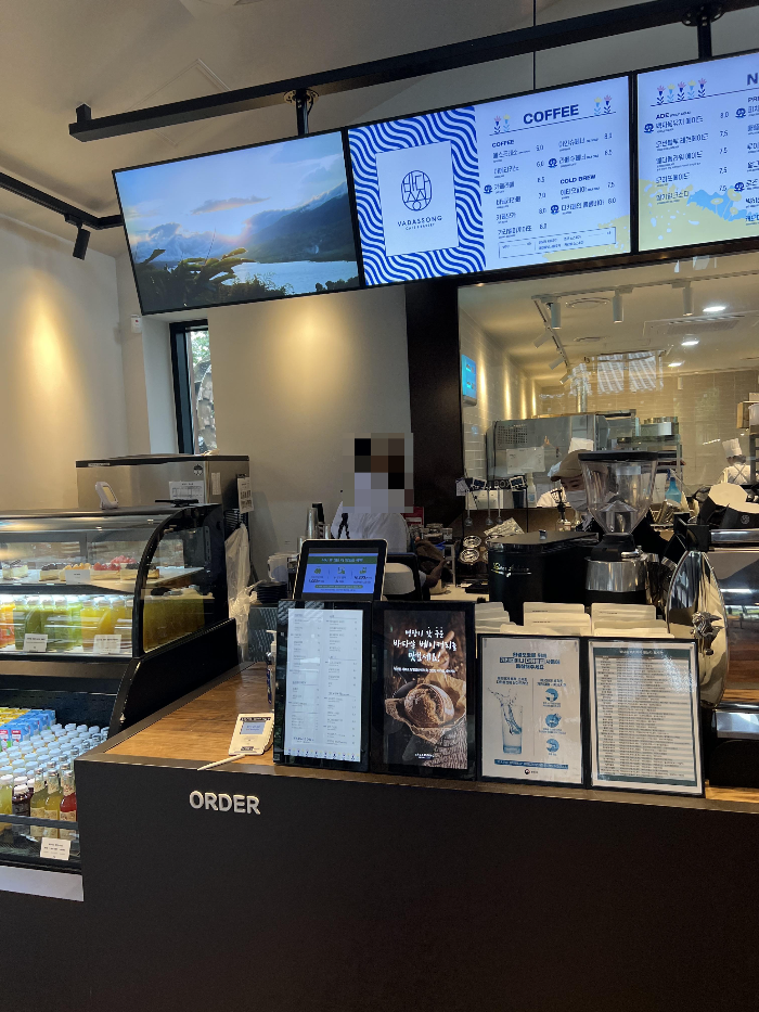 바다쏭 카페의 아메리카노는 대형카페인 규모에 맞게 6,000원 정도로 판매하고 있습니다. 그외 라떼류는 8,000원 정도이니 관람료라 생각하고 즐기시면 될거 같습니다.