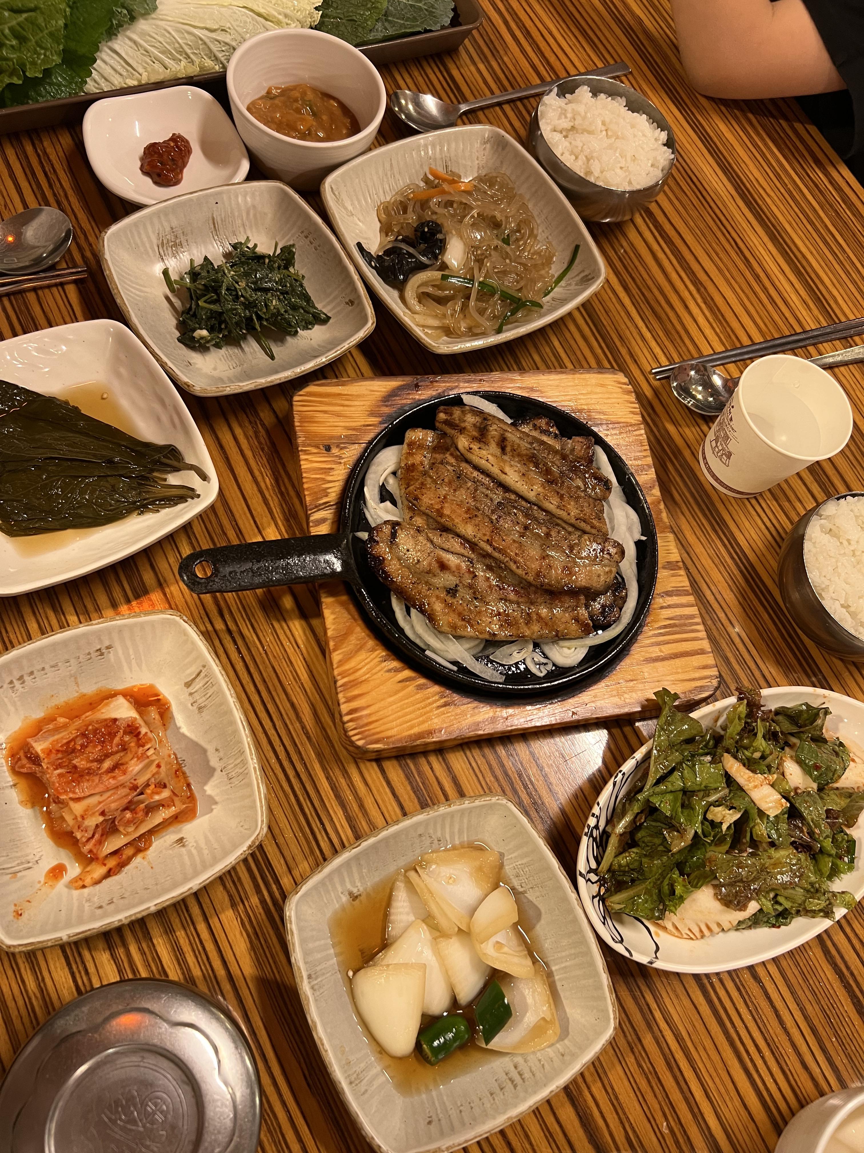 먼저 기본반찬이 나오는데 깻잎, 상추무침, 김치, 잡채, 나물, 양파장아찌가 나옵니다. 특히 잡채랑 깻잎은 너무 맛있어서 리필해서 먹었습니다.