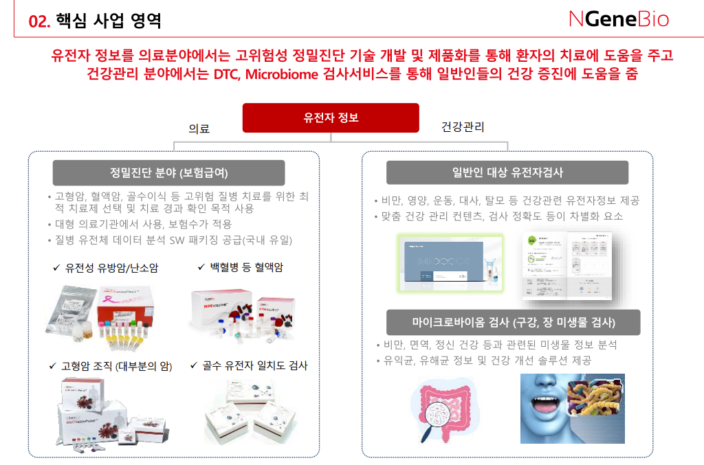 엔젠바이오의 핵심 사업 영역을 보시면 유전자 정보를 의료분야에서 고위험성 정밀진단 기술 개발 및 제품화를 통해 환자의 치료에 도움을 주고 건강관리 분야에서는 DTC, Microbiome 검사 서비스를 통해 일반인들의 건강 증진에 도움을 주고 있습니다.