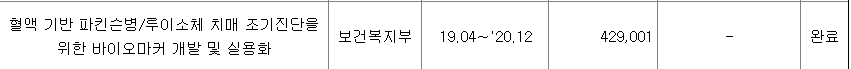 엔젠바이오 사업보고서에 보면 혈액 기반 파킨슨병/ 루이소체 치매 조기진단을 위한 바이오마커 개발 및 실용화를 보건복지부에서 2020년 12월에 완료되었다고 나와있습니다.