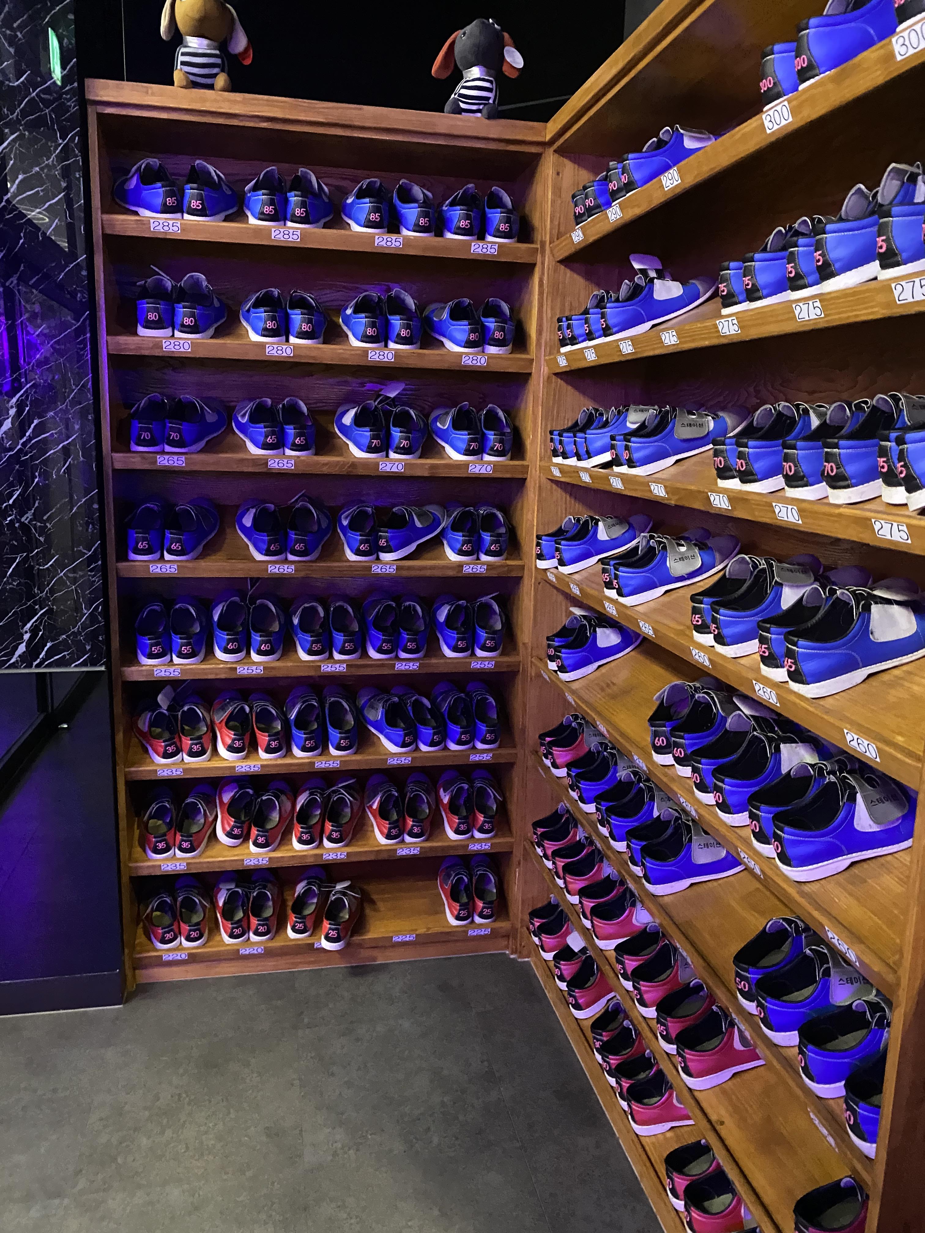 신발은 대여가 가능하고, 발 사이즈 별로 진열이 되어있습니다. 볼링화 사이즈를 고를 때는 본인 발 사이즈보다 한치수 큰 것을 고르시는 것이 좋습니다.