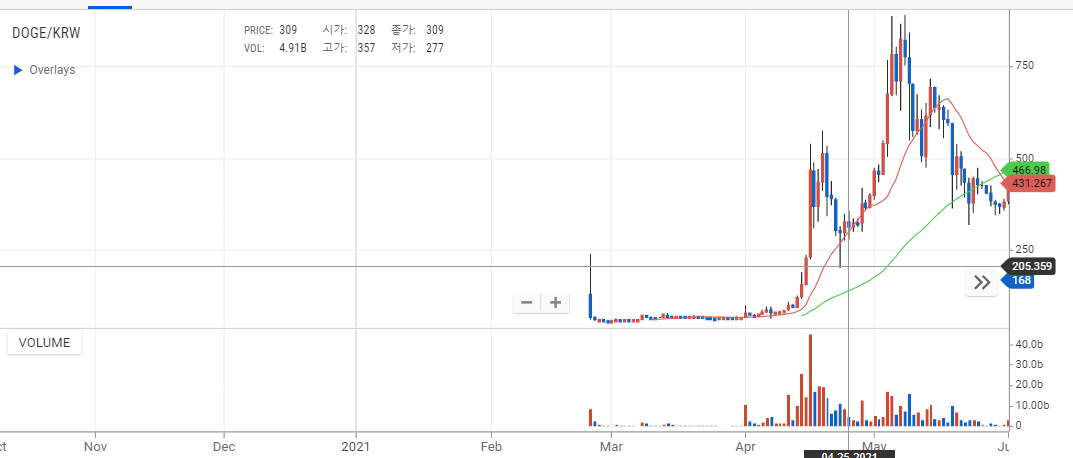 도지코인은 200원 부근에서 800원까지 약 4배 가까이 폭등을 하면서 많은 화재를 불러일으켰습니다. 장난으로 시작된 도지코인이 가치가 있을까? 라는 의문이 있었지만 가격은 말도 안되게 상승을 하였고, 실제로 일론 머스크가 도지코인을 결제수단으로 사용할 계획이라고 덧붙히면서 활용 가치에 대한 기대도 만들게 되었습니다.