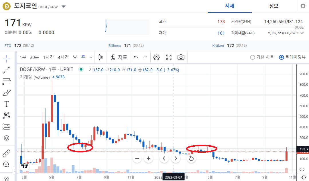 도지코인 주봉 차트를 보시면 200원 부근대에 엄청난 매물대가 자리 잡고 있기 때문에 뚫기는 쉽지 않을 거 같습니다. 일론 머스크가 언제 바뀔지 모르기 때문에 신중한 투자가 필요할 것으로 보입니다.
