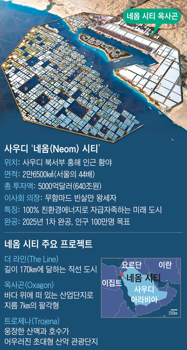 사우디 네옴시티는 서울의 44배 규모에 달하며, 총투자액만 640조 원에 이릅니다. 100% 친환경에너지로 자급자족하는 미래도시를 목표료 2025년 1차완공, 인구 100만을 목표료 하고 있는 프로젝트입니다.
