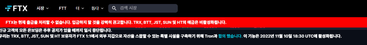 결국 이틀 뒤인 11월 9일에 FTX 거래소는 온체인 출금을 중단을 시키면서 사태가 일파만파 진행되면서 가상화폐 시장에서 불안감을 키우게 되었습니다.