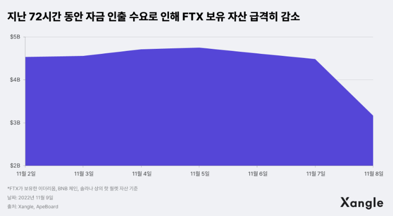 이로 인하여 FTX 보유 자산이 급격히 감소하게 되었으며, FTX CEO는 고객 상환 능력이 충분하여 괜찮다고 투자자들의 환심을 샀지만 불안함에 뱅크런 사태에 이르게 되었습니다.
