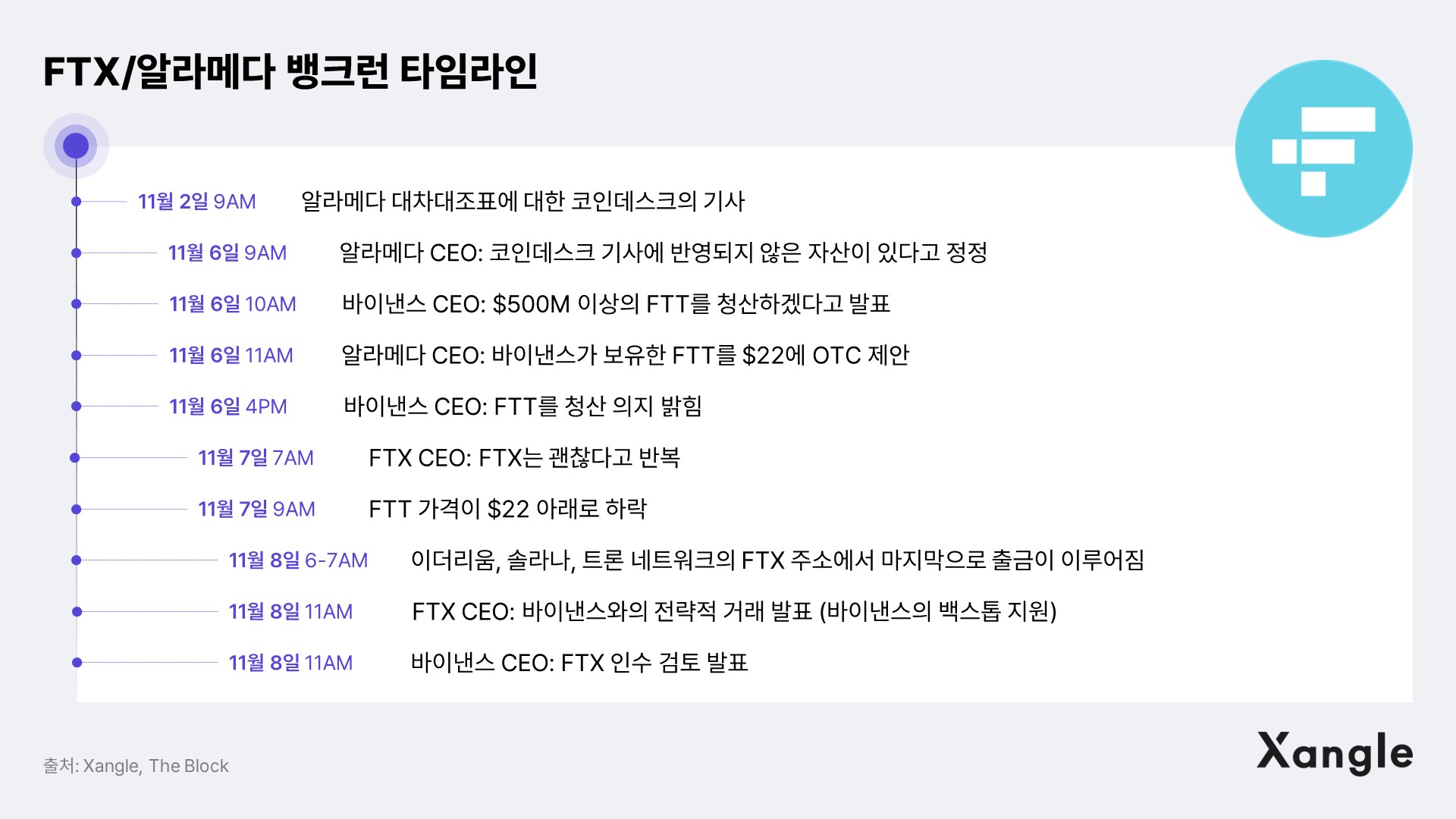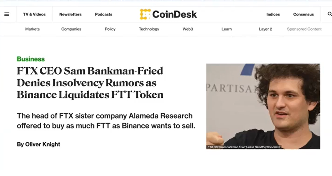 FTX의 자회사에서 바이낸스에게 OTC 딜 거래를 제안했습니다 FTT를 개당 $22에 매수하겠다고 했지만 바이낸스 CEO 창평차오는 이를 거부하면서 매도를 하게 되었고, 이로 인해 FTX 거래소에서 자금을 인출하기 시작하였습니다.