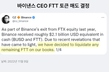 이를 지켜본 바이낸스(거래소 1위 거래소) CEO인 창평자오는 리스크 관리 차원에서 보유하고 있는 FTT의 토큰을 매도할 것이라고 트윗을 하면서 사태가 시작되었습니다.