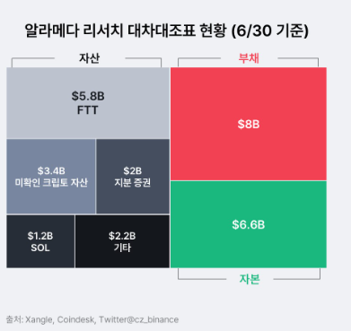 FTX의 핵심 자회사인 Alameda Research의 재무제표를 일부 공개를 하였고, 대차대조표에 기록된 자산의 대부분이 FTT(FTX 거래소 토큰) 이거나 샘 뱅크먼과 관련된 솔라나 생태계 자산 등이라는 것이 밝혀졌습니다.