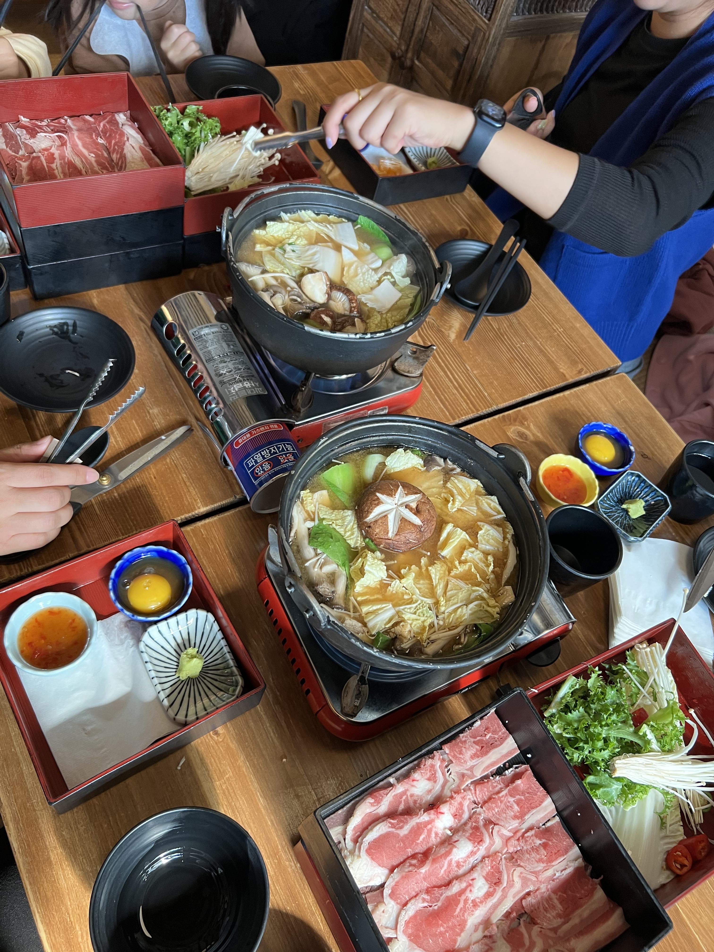 세팅을 다하고 고기를 샤브샤브 국물에 익혀서 야채와 함께 소스에 묻혀 먹으면 정말 맛있습니다. 깔끔하고 깊은 맛이 느껴져서 왜 줄 서서 먹는지 알았습니다. 고기, 야채의 신선함과 국물의 깊은 맛이 어우러져 맛있게 먹었습니다.
