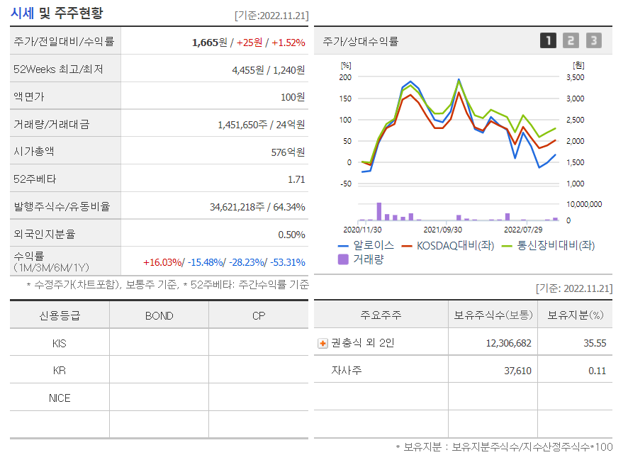 알로이스의 시가총액 576억 원으로 소형주에 해당합니다. 주요 주주는 권충식 외 2인이 35.5% 지분을 소유하고 있습니다.