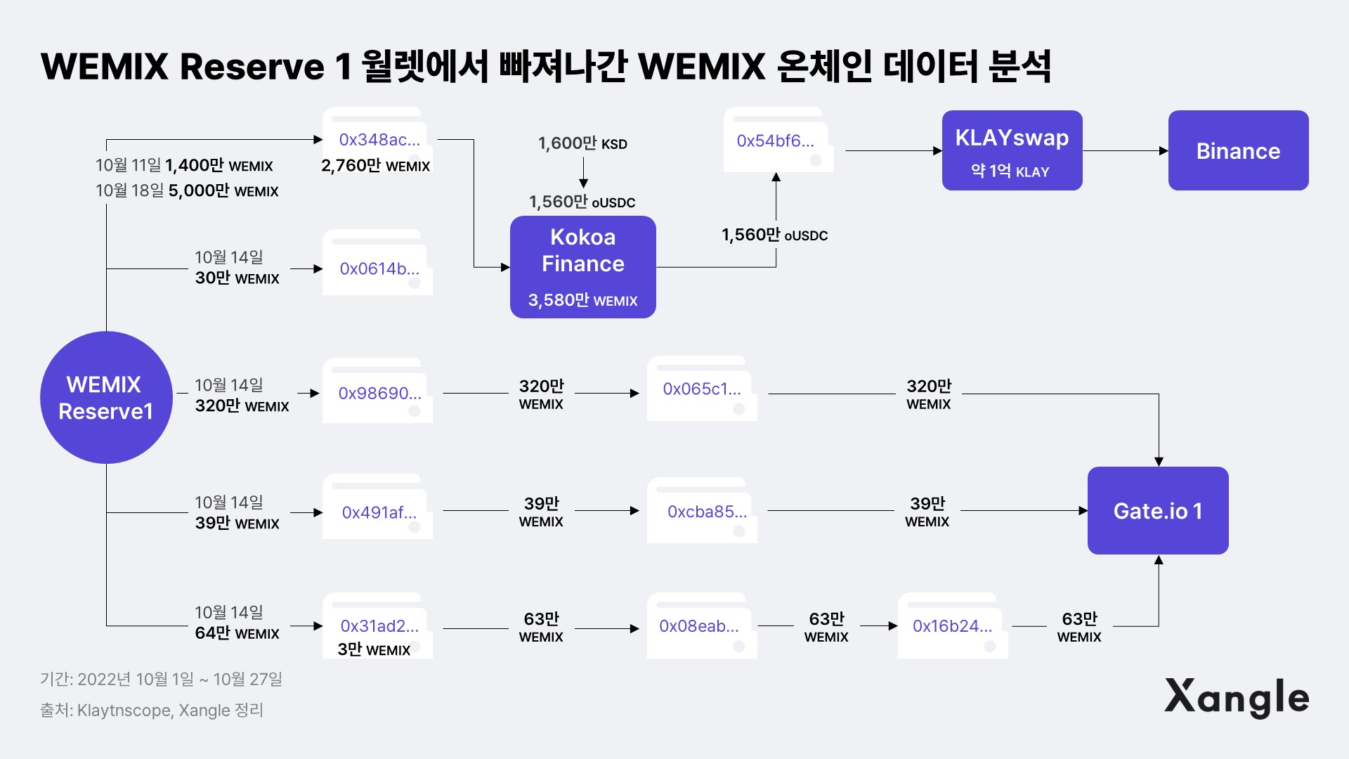 위믹스 재단에서 DAXA 제출한 공시자료와 차이는 약 7,000만개의 차이가 발생하였고, 그 중 3,580만개의 위믹스가 디파이 서비스인 코코아파이낸스에서 KSD(스테이블 코인) 대출에 대한 담보가 1,600만개의 KSD이며, 이후 USDC로 스왑하여 여서 다른 디파이 서비스인 클레이스왑을 통해 클레이로 전환 후 바이낸스로 이동했습니다.