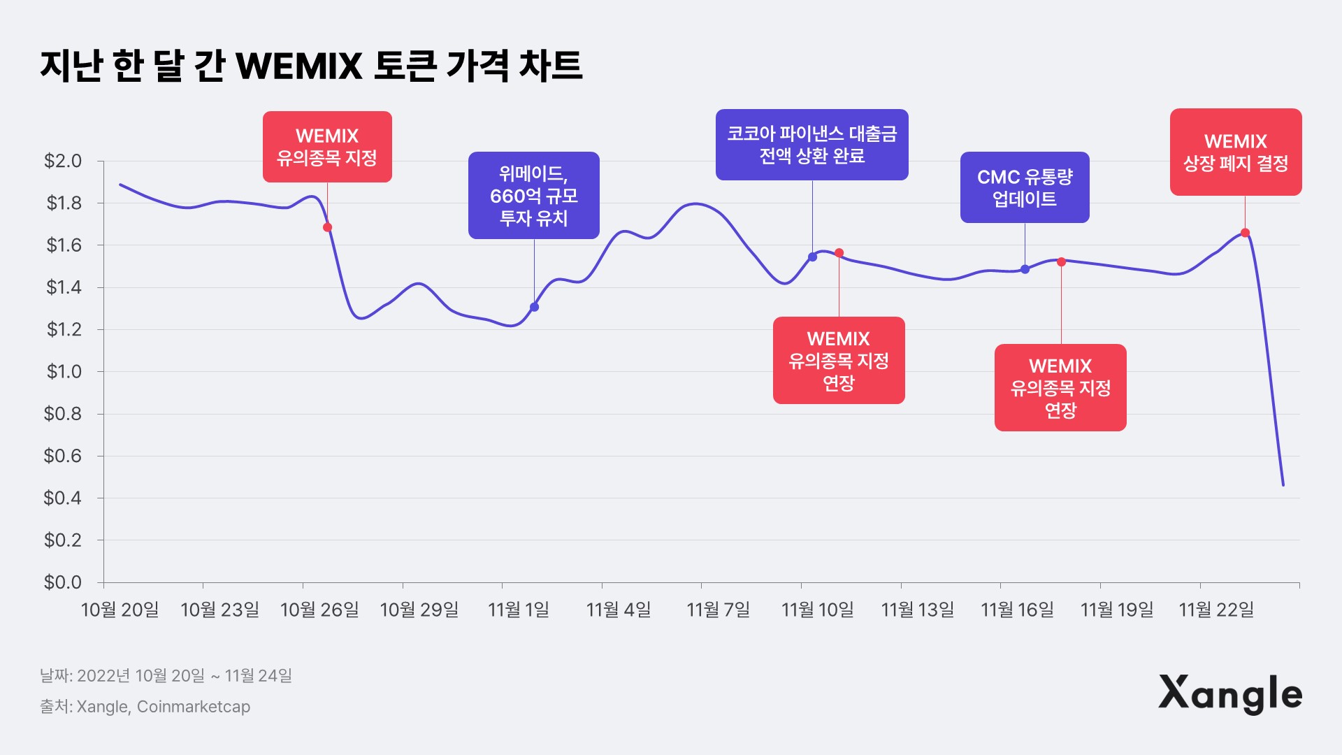 안녕하세요 벨카입니다. 위믹스가 국내 가상화폐 거래소에서 상장폐지가 결정되면서 위믹스의 하락세와 더불어 11/25 위메이드 관련주들이 하한가를 보여주면서 존폐 위기에 처해있는 상황입니다. 무슨 상황인지 자세히 포스팅하도록 하겠습니다.