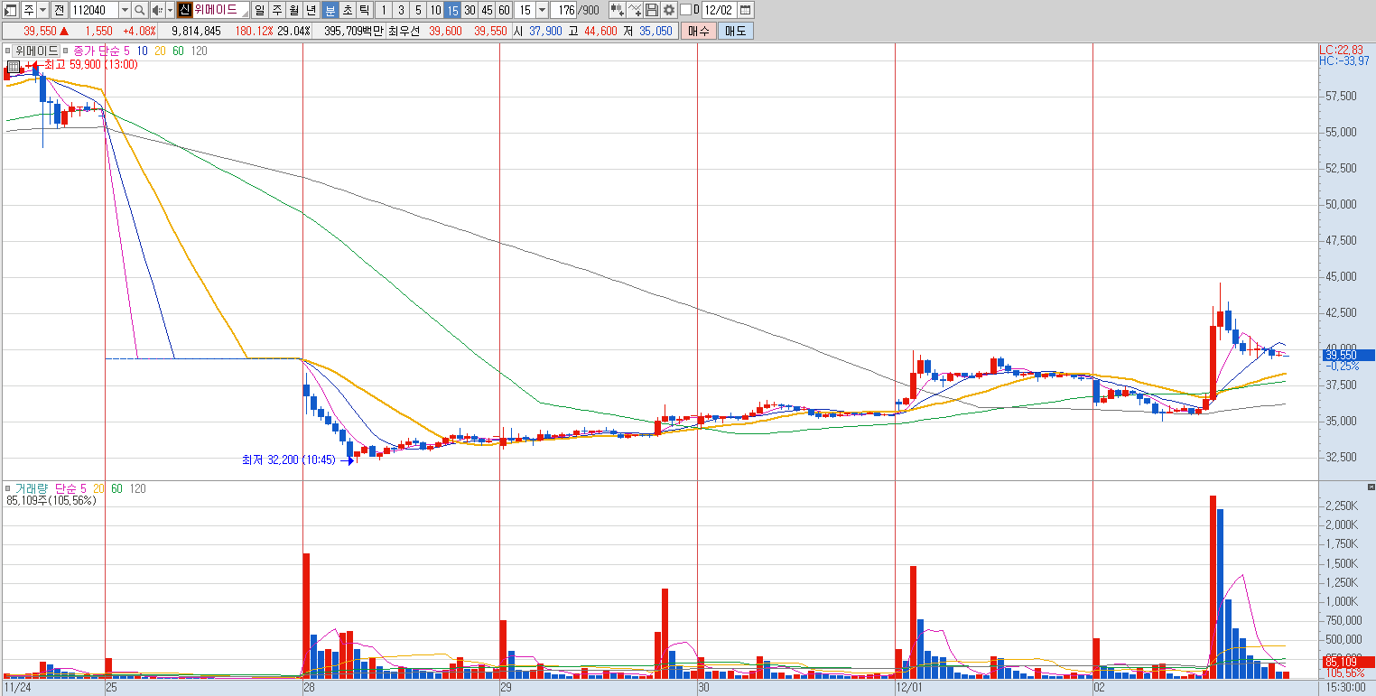 위메이드 15분 봉 차트를 보면 1시부터 상승을 하면서 44,600원까지 반등을 하고 조정을 받은 모습입니다. 지난 11월 25일 하한가 가격을 터치하고 갭을 메꾸는 모습을 보여주고 있습니다. 시장의 관심을 많이 받고 있는 만큼 변동성이 있을 거라 예상이 됩니다.